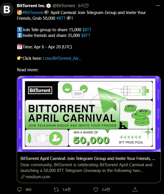 이건 방금 알게된 비트토렌트 (BTT) 자그마치 15,000BTT 에어드랍(무상증자?ㅋ 암튼 공짜) 받는 이벤트가 있네요! 텔레그램이랑 트위터를 몇번 왔다갔다 해야하지만 몇가지 스텝만으로 15,000BTT 준다고 하니까 밑져야 본전아잉가요? 뭐ㅋ